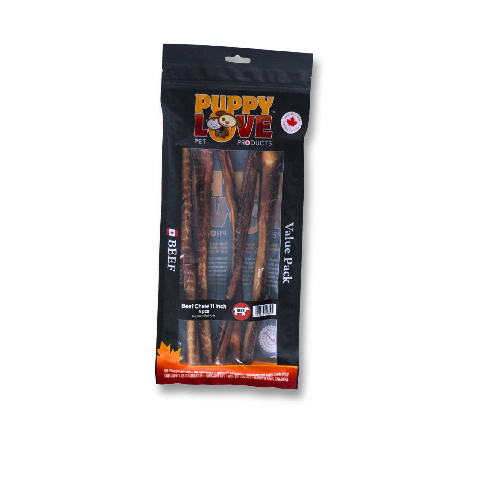 Puppy Love Beef Chews- 11 inches Puppy Love Sale! from 2379 /per Qty. Add to Cart This item is currently on backorder but you can still purchase it now and we'll ship as soon as more become available. Contains five 11 inch chews. This is a softer chew for smaller and senior dogs. Beef Chews are good source of protein and promote dental health.